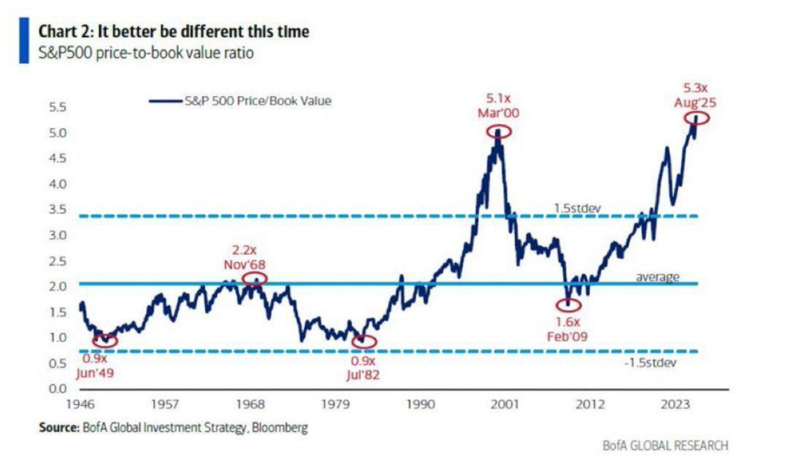 Kết quả là định giá cổ phiếu đã tăng vọt đến mức cực đoan trong lịch sử, vượt xa nền kinh tế thực. Một chỉ số định giá đơn giản, tỷ lệ giá trên giá trị sổ sách (P/B) của S&P 500, gần đây đã đạt mức cao nhất mọi thời đại là khoảng 5.3 lần. Để so sánh, mức này thậm chí còn vượt qua đỉnh điểm của bong bóng dot-com năm 2000 (khi P/B đạt khoảng 5.1 lần) và cao gấp đôi mức trung bình lịch sử dài hạn (khoảng 2.0 lần).