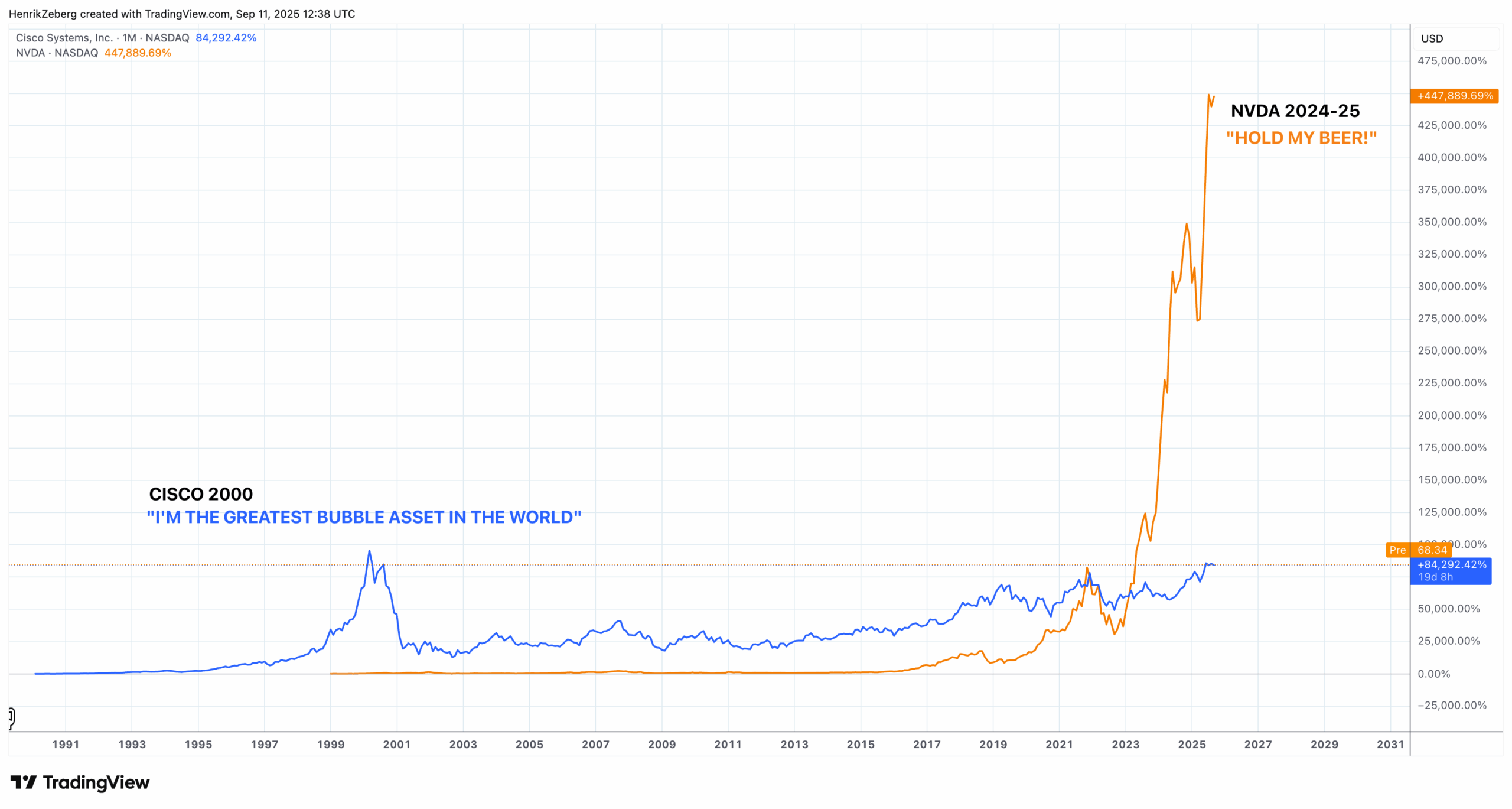 Không chỉ là các tỷ lệ trừu tượng – sự dẫn dắt và hành vi của thị trường cũng cho thấy sự hưng phấn tột độ. Một số ít các công ty công nghệ khổng lồ đã chiếm phần lớn sự tăng trưởng. Ví dụ, NVIDIA – biểu tượng của cơn sốt AI – đã chứng kiến giá cổ phiếu của mình tăng gần như thẳng đứng. Trong hai thập kỷ qua, giá cổ phiếu của NVIDIA đã tăng một cách khó tin 447,000%, vượt xa mức tăng khoảng 84,000% mà Cisco Systems đạt được trong những năm 1990 trong cơn sốt Internet (trước khi nó sụp đổ). Một sự so sánh vui cho thấy biểu đồ giá cổ phiếu NVIDIA bên cạnh biểu đồ của Cisco năm 2000, và sự tương đồng là rất đáng chú ý – ngoại trừ việc đà tăng của NVIDIA còn dốc hơn. Điều này đặt ra câu hỏi: Liệu lần này có khác biệt, hay những cổ phiếu “bay cao” ngày nay sẽ đối mặt với số phận tương tự như Cisco?