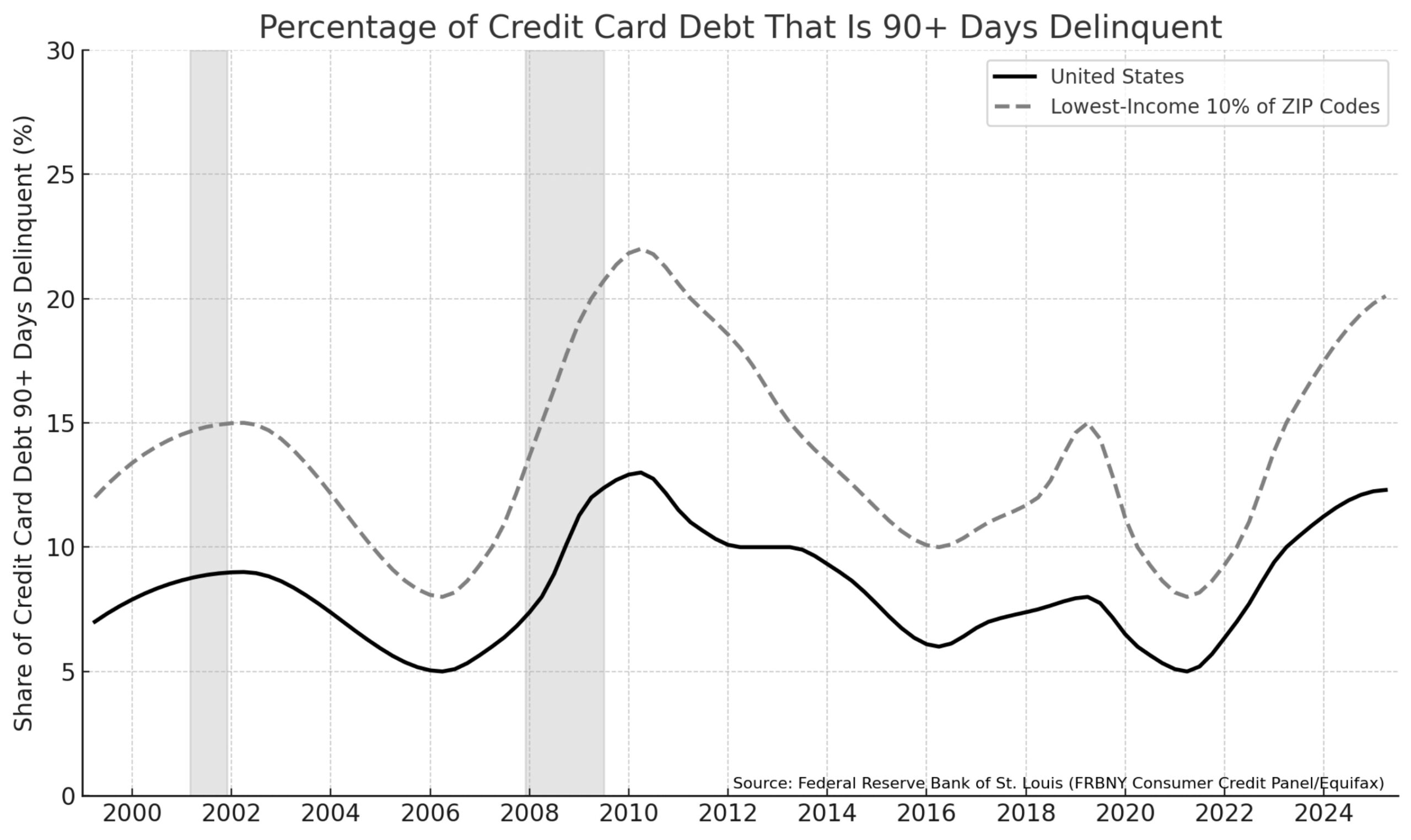 - Tỷ lệ nợ quá hạn tăng: Tỷ lệ chủ thẻ không thanh toán đúng hạn đang tăng. Vào đầu năm 2025, tỷ lệ nợ thẻ tín dụng quá hạn nghiêm trọng (quá 90 ngày) đã đạt mức gần bằng mức được thấy trong cuộc khủng hoảng năm 2008, một diễn biến đáng báo động.