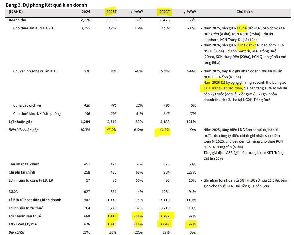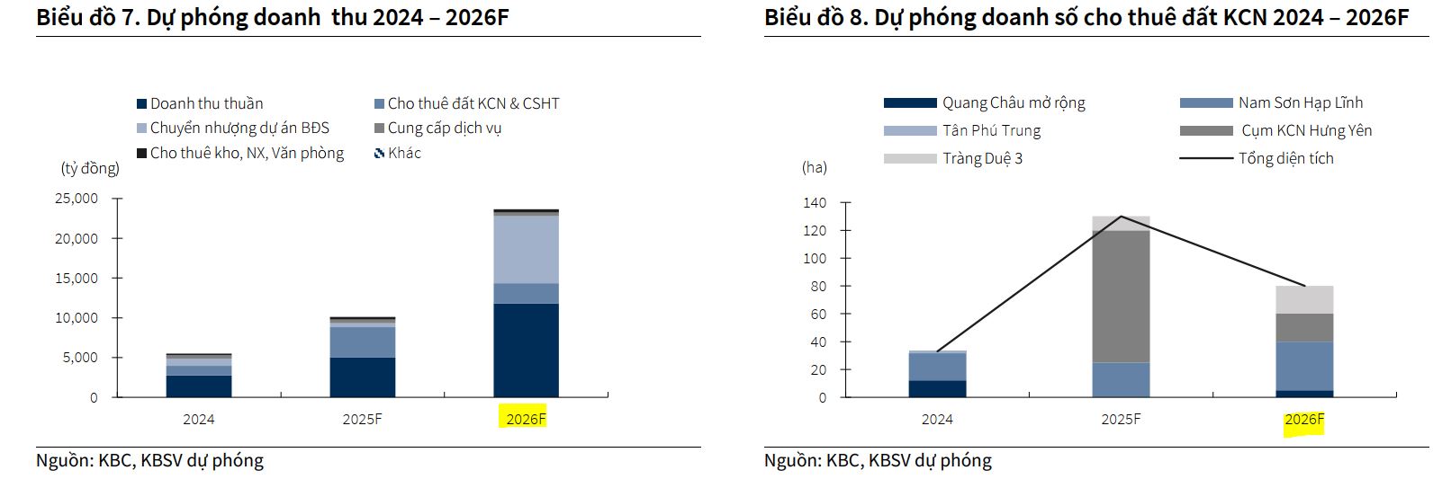 Mặc dù đã hoàn thành các thủ tục pháp lý, tiến độ mở bán của KĐT Tràng Cát vẫn có thể kéo dài, ảnh hưởng đến dòng tiền và lợi nhuận của công ty. KBSV duy trì kỳ vọng KCN có thể bắt mở bán dự án vào năm 2026, ước tính doanh số bán hàng trong 2026 đạt 20ha.