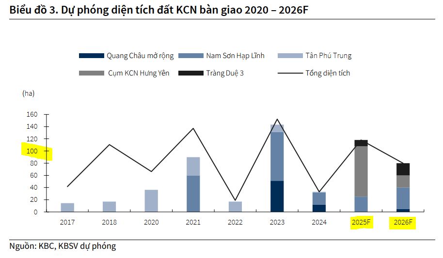 Dự báo doanh số bàn giao đất KCN trong năm 2025 và 2026 sẽ chậm lại, đạt lần lượt 130 ha và 80 ha, được đóng góp chủ yếu bởi KCN Hưng Yên, KCN Nam Sơn Hạp Lĩnh, KCN Tràng Duệ 3, do bối cảnh “Tradewar 2.0” gia tăng rào cản trong việc thu hút FDI vào các ngành công nghệ cao – tệp khách hàng chiến lược của KBC.