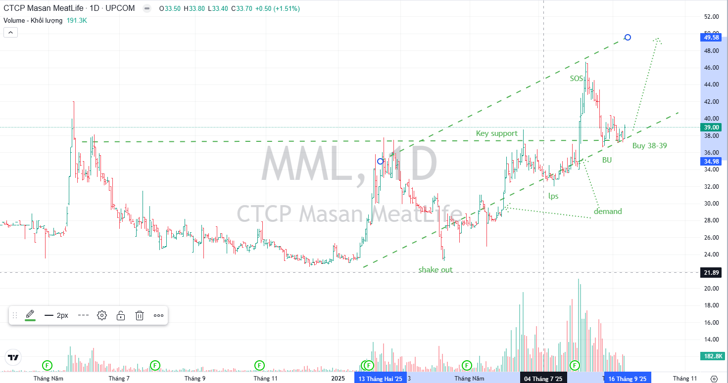 Trên đồ thị kỹ thuật, MML đã break đỉnh 52w hiện tại đang test lại Ma50 với vol thấp. Ngày 14/9 MML bật lên Ma50 cho tín hiệu mua ở vùng giá 39. Khuyến nghị ngày 15/9 : MUA