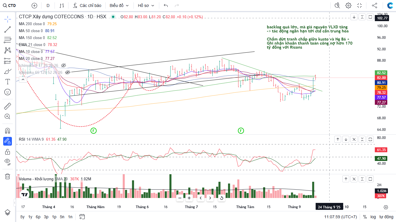 BVSC (15.09.2025) khuyên nghị OUTPERFORM, với giá mục tiêu là 97,374 đồng (Upside +18.9%). Theo BVSC, giai đoạn khó khăn của CTD đã qua đi. Triển vọng của công ty đang rất tích cực nhờ lượng hợp đồng ký mới và backlog lớn nhất từ trước tới nay, cùng với sự khởi sắc ở cả ba mảng kinh doanh chính, khả quan về tiềm năng của CTD trong trung và dài hạn.