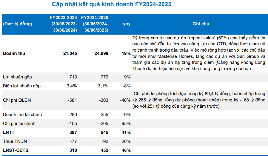 • Năng lực thi công và mối quan hệ với chủ đầu tư khẳng định qua tỷ lệ “repeat sales” 69% doanh thu FY24–25, giúp CTD duy trì biên lợi nhuận gộp dự kiến cải thiện lên 4% trong FY25–26 dù backlog lớn.