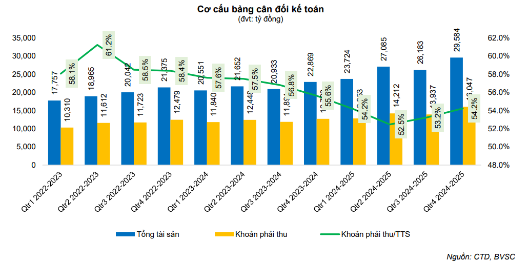 Tiến trình thu hồi giúp tỷ lệ phải thu / doanh thu đi xuống sau ba năm tăng mạnh, giảm áp lực vốn lưu động khi backlog bước vào giai đoạn triển khai cao điểm.