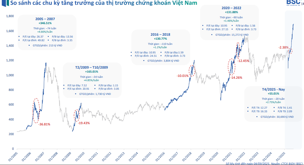 Từ cuối quý 4/2024 đến đầu quý 3/2025, VN-Index tăng khoảng +55% chỉ trong 20 tuần, tương đương mức tăng trung bình +2.75% mỗi tuần. So sánh với các chu kỳ trước cho thấy đà tăng hiện tại tuy ấn tượng nhưng vẫn khiêm tốn về mặt phần trăm tăng điểm. Giai đoạn 2005–2007 kéo dài gần 74 tuần, tăng tổng +346.51% (tương đương +4.66%/tuần), còn đợt bùng nổ năm 2009 cũng chỉ mất 34 tuần để đạt +165.01% (+4.85%/tuần).