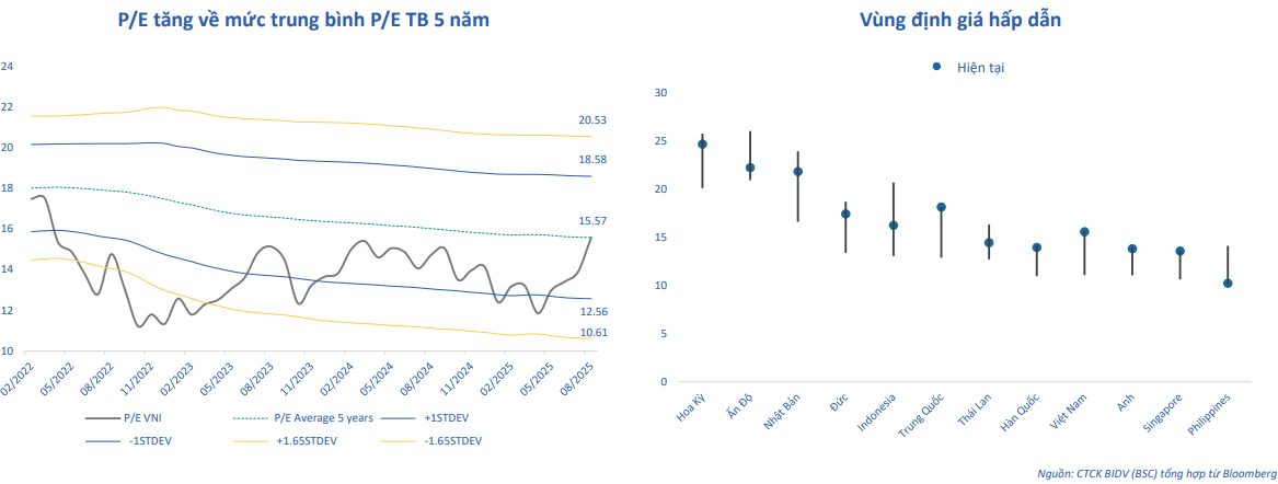 Hệ số P/E của VN-Index kết tháng 8/2025 đóng ở 15.57×, bằng đúng mức trung bình 5 năm và đã tăng 12.2% so với đầu tháng, đang tiệm cận vùng +1 độ lệch chuẩn. P/B chốt ở 2.07×, tăng 12.5% MoM, cũng nằm trên mức trung bình dài hạn => tức là thị trường hiện tại không còn rẻ nữa. .