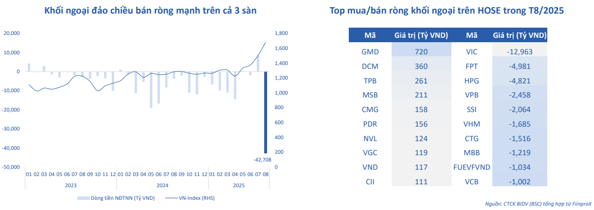 Trong tháng 8/2025, dòng vốn của nhà đầu tư nước ngoài đã đảo chiều từ mua ròng sang bán ròng mạnh với tổng giá trị hơn 42,708 tỷ đồng trên cả ba sàn. Động lực chính khiến khối ngoại rút vốn là lo ngại biến động tỷ giá USD/VND, khi tỷ giá lên gần 26,132 VND/USD đã làm tăng rủi ro chuyển đổi, thúc họ tìm đến các kênh trú ẩn an toàn hơn.