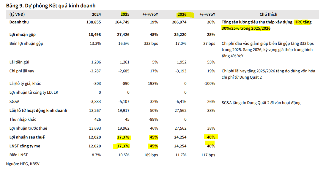 KBSV điều chỉnh dự phóng biên lãi gộp của HPG đạt 16.6%/17.0%/16.9% trong 2025/2026/2027, kỳ vọng giá thép tăng 4%/5% YoY trong 2026/2027.
