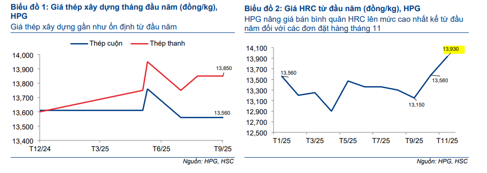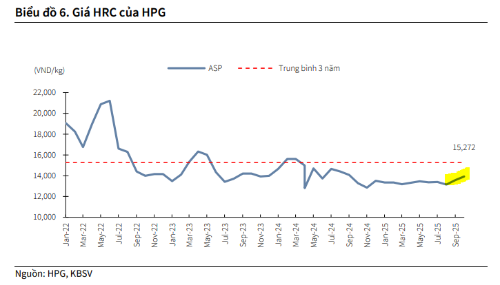 Trong tháng 08-09/2025, HPG tăng giá HRC kỳ hạn lần lượt 430/350 VND/kg (tăng 3.3%/2.6% MoM), phản ánh kỳ vọng nhu cầu tiêu thụ tiếp tục gia tăng trong thời gian tới. Theo quan điểm của CTCP Chứng khoán KB Việt Nam (KBSV), Tập đoàn Hòa Phát (HPG) đã có kết quả kinh doanh nửa đầu năm 2025 tích cực, hoàn thành 51% kế hoạch lợi nhuận cả năm. KBSV duy trì khuyến nghị MUA đối với cổ phiếu HPG, đồng thời nâng giá mục tiêu lên 35,300 đồng/cổ phiếu. Luận điểm chính của KBSV dựa vào sự phục hồi của thị trường bất động sản và đầu tư công, cùng với việc mở rộng công suất từ dự án Dung Quất 2.