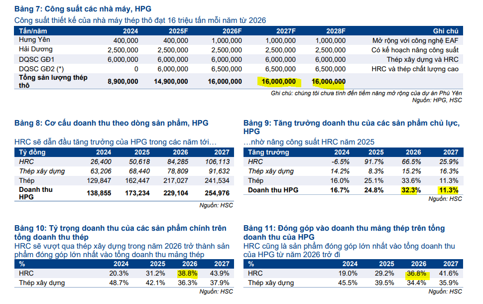 Lò cao số 2 tại Dung Quất 2 là động lực tăng trưởng mới: Dự kiến vận hành từ quý 4/2025, lò cao này giúp tăng mạnh sản lượng HRC, với kỳ vọng giá thép tăng 4–5% trong 2026–2027. KBSV nâng dự phóng sản lượng HRC năm 2025 lên 61% YoY.