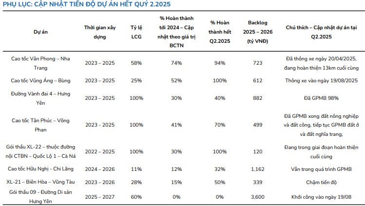 - Backlog & nghiệm thu dồi dào: Tổng backlog gần 7,937 tỷ đồng, với phần việc còn lại tại các dự án cao tốc – vành đai như Vân Phong–Nha Trang 723 tỷ, Vũng Áng–Bùng 612 tỷ, Vành đai 4 Hưng Yên 882 tỷ, Tân Phúc–Võng Phan 499 tỷ, Hữu Nghị–Chi Lăng 1,162 tỷ và Biên Hòa–Vũng Tàu 339 tỷ, sắp được nghiệm thu, giữ biên gộp quanh 13% và đảm bảo dòng tiền mạnh 2H/2025.