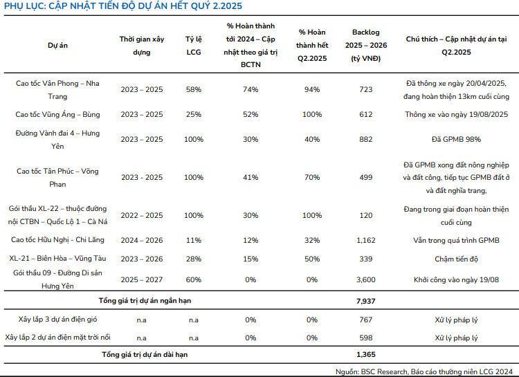 - Dự án Vân Phong – Nha Trang đã thông xe ngày 20/04/2025, với 94% khối lượng hoàn thành và khoảng 13 km cuối cùng chưa nghiệm thu, tương đương phần việc còn lại của LCG gần 723 tỷ đồng.