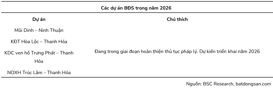 Năm 2025, bất động sản dự kiến chỉ đóng góp khoảng 16 tỷ đồng, chủ yếu từ dự án cũ; BSC kỳ vọng 2026 có thể xuất hiện lợi nhuận đột biến nếu các dự án Mũi Dinh – Ninh Thuận, KĐT Hòa Lộc, KDC ven hồ Trưng Phát và NOXH Trúc Lâm hoàn thiện pháp lý và triển khai.