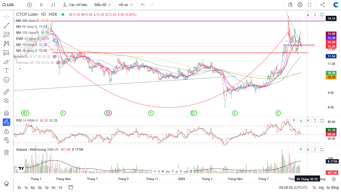 Trên đồ thị kỹ thuật, LCG có RS=84, mức hoạt động tốt trên thị trường. LCG đang có phiên hồi kỹ thuật khi về vùng hỗ trợ ở 12,300 đồng sau khi không breakout thành công vào ngày 15/9, điều chỉnh với vol thấp nên vẫn có thể tiếp tục nắm giữ.