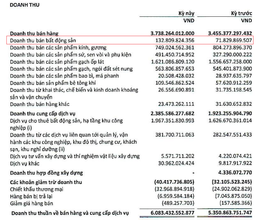 - Doanh thu thuần đạt 6,083 tỷ đồng, tăng 14% so với cùng kỳ; trong đó mảng bất động sản chỉ đóng góp khoảng 133 tỷ đồng (2% tổng doanh thu), nhưng tốc độ tăng trưởng lên đến 85% so với cùng kỳ năm trước.