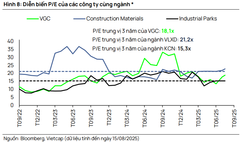 Theo quan điểm của Vietcap, định giá của VGC đã phản ánh đúng hoạt động kinh doanh hiện tại, với P/E dự phóng các năm 2025 và 2026 lần lượt ở mức 20.7 lần và 14.9 lần. Quan sát điểm hỗ trợ ở: Nhận được phê duyệt đầu tư đối với các dự án KCN và khu đô thị (KĐT) mới (~1,000ha).