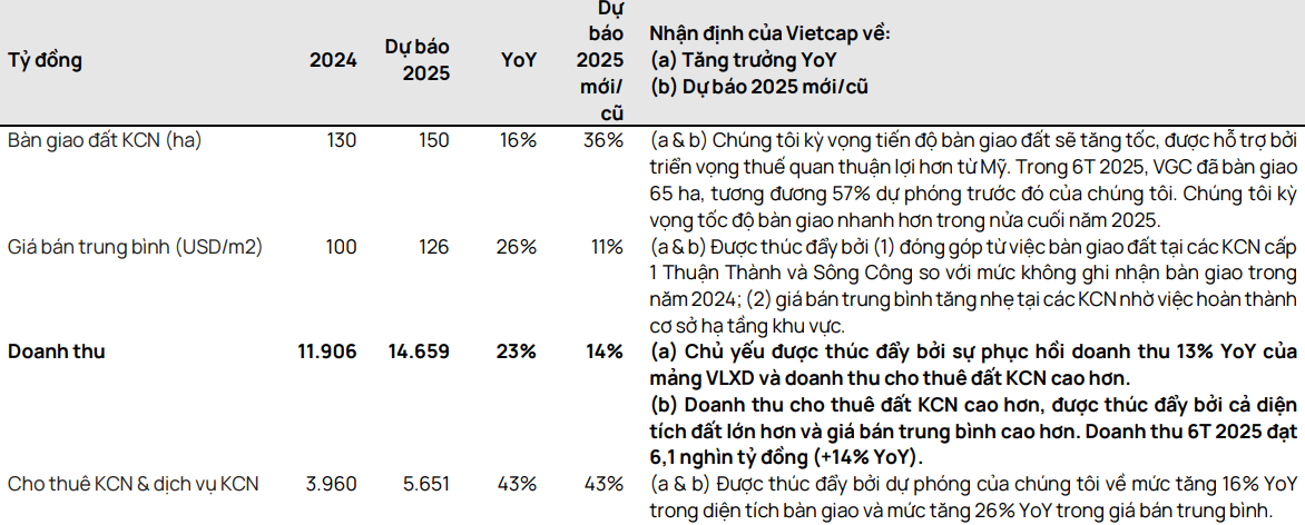 Nhờ diện tích bàn giao tăng 16% YoY, kỳ vọng bàn giao 150 ha đất trong năm nay với giá thuê bình quân tăng từ 100 lên 126 USD/m², doanh thu mảng “Cho thuê KCN & dịch vụ KCN” được dự báo đạt 5,651 tỷ đồng năm 2025, tăng 43% so với 3,960 tỷ đồng năm 2024.