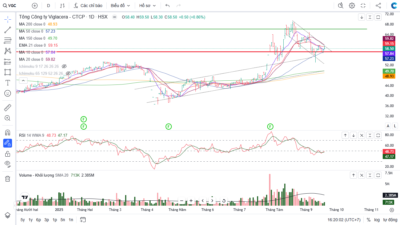 Trên biểu đồ kỹ thuật, VGC có RS=82, mức hoạt động tốt trên thị trường. VGC đang tìm điểm hỗ trợ ở MA50 ngày, đây cũng được coi là vũng hỗ trợ cứng của VGC (quanh vùng giá 57,000 đồng), VGC đang nằm trong mẫu hình tam giác cân, và vận động giá hiện tại có thể được coi là phân cuối của nêm giảm, chú ý vùng cung quanh giá 65,000-66.000 đồng, đây là vùng cung tương đối lớn, đã có 2 lần breakout failed quanh vùng giá này.