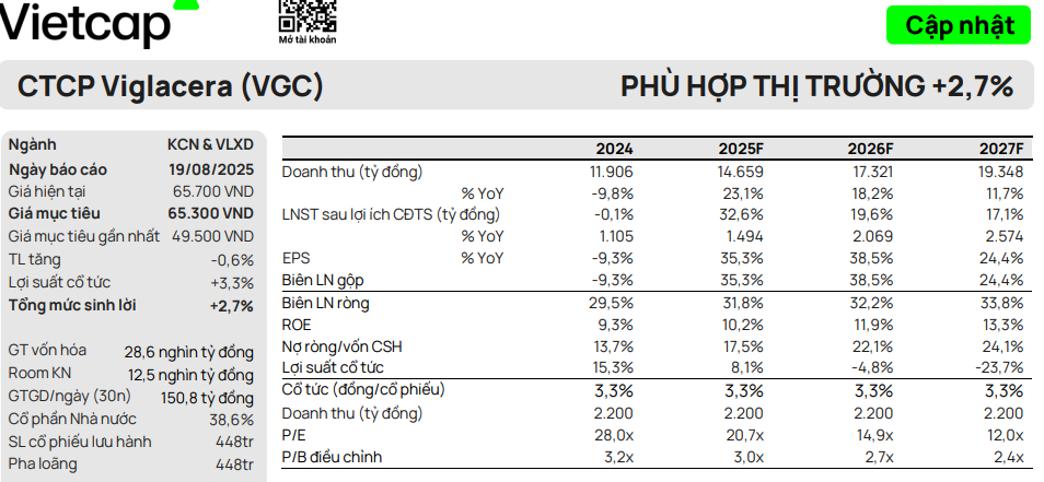 Vietcap (19.08.2025) đưa giá mục tiêu cho VGC là 65,300 đồng/cp, hạ khuyến nghị từ KHẢ QUAN xuống PHÙ HỢP THỊ TRƯỜNG do giá cổ phiếu đã tăng 46% trong 50 ngày qua (xét ở ngày 19.08.2025). Theo đó, dự báo LNST sau lợi ích CĐTS năm 2025 sẽ đạt 1,494 tỷ đồng (+35% YoY), nhờ được thúc đẩy bởi (1) mức tăng 43% YoY của lợi nhuận gộp mảng cho thuê đất & dịch vụ KCN cùng với (2) mức tăng 15% YoY của lợi nhuận gộp mảng VLXD.
