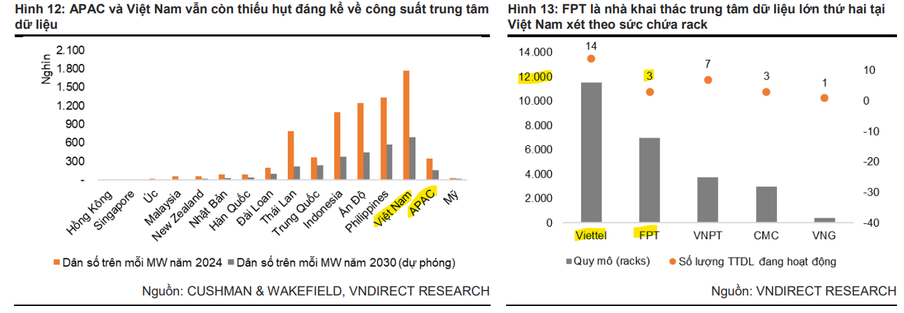 Về lĩnh vực cho thuê trung tâm dữ liệu (DC), thị trường APAC đã tăng trưởng nhanh chóng trong những năm gần đây, với Singapore và Hong Kong là các trung tâm chính, trong khi các thị trường mới nổi như Thái Lan và Ấn Độ đang dần bắt kịp. Theo KPMG, APAC là một trong những khu vực tăng trưởng nhanh nhất về công suất DC, dự kiến tăng gấp đôi lên 37GW vào năm 2030 (CAGR +13.1%). Theo Cushman & Wakefield, hầu hết các quốc gia APAC vẫn thiếu hụt nghiêm trọng về công suất DC, với mật độ trung bình 350,000 người/MW – cao gấp 10 lần chuẩn của Mỹ (30,600 người/MW). Số liệu này có sự phân hóa rõ rệt đối với từng quốc gia trong khu vực, ví dụ như Singapore ở mức 8,700 người/MW trong khi mật độ tại Việt Nam, Indonesia, Ấn Độ và Philippines vượt quá 1 triệu người/MW.