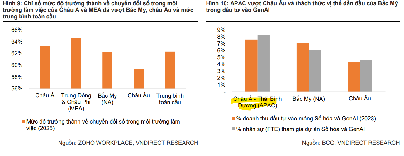 Đối với khu vực APAC, VNDirect kỳ vọng tâm lý chi tiêu CNTT sẽ phục hồi trong nửa cuối năm 2025 sau khi các đàm phán giảm thuế quan thành công. Về dài hạn, APAC đang nổi lên như một động lực tăng trưởng mới, dẫn đầu về chuyển đổi số trong môi trường làm việc và ứng dụng AI tạo sinh (GEN AI). VNDirect dự báo doanh thu dịch vụ CNTT tại APAC tăng 10% trong 2025 và 35% trong 2026 (do mức nền thấp của năm 2025).