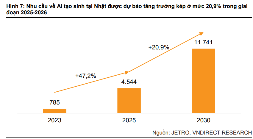 VNDirect cho rằng thị trường Nhật Bản sẽ tiếp tục là động lực tăng trưởng chính cho dịch vụ CNTT toàn cầu của FPT. Dù có một số chậm trễ trong chuyển đổi số, chính phủ Nhật Bản đang đẩy mạnh các chính sách nhằm giải quyết vấn đề này. Theo Hiệp hội các Ngành Điện tử và Công nghệ Thông tin Nhật Bản (JETRO), nhu cầu AI tạo sinh tại Nhật dự kiến tăng trưởng kép ở mức 20.9% trong giai đoạn 2025-2030.