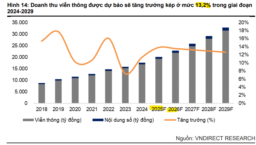 Mảng Viễn Thông: VNDirect kỳ vọng doanh thu mảng viễn thông tăng trưởng 13.8%/13.5% yoy trong giai đoạn 2025-2026, chủ yếu nhờ internet băng rộng và mảng cho thuê DC.