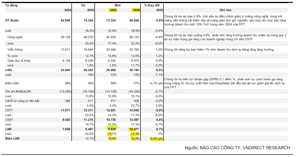 Theo đó, VNDirect kỳ vọng xu hướng trì hoãn chi tiêu CNTT tại APAC sẽ được nới lỏng, tạo điều kiện cho doanh thu dịch vụ CNTT phục hồi trong nửa cuối năm 2025. Theo FPT, công ty đã ghi nhận tín hiệu tích cực từ khách hàng trong các cuộc thảo luận, cùng với một số dấu hiệu phục hồi trong nửa sau 2025.