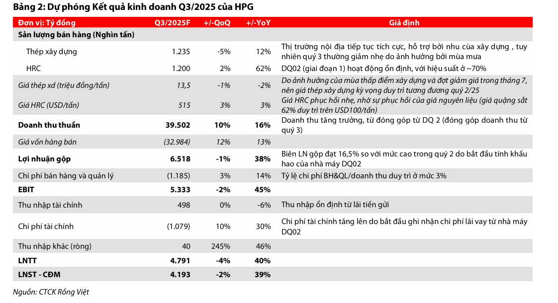 VDSC kỳ vọng HPG sẽ tiếp tục duy trì đà tăng trưởng trong quý 3/2025. Mặc dù sản lượng thép xây dựng có thể giảm nhẹ do yếu tố mùa vụ, sản lượng HRC được dự báo sẽ tăng 62% so với cùng kỳ. Điều này giúp doanh thu và lợi nhuận của HPG tiếp tục tăng trưởng lần lượt là 16%39% so với cùng kỳ năm 2024, tương ứng 39,502 tỷ và 4,193 tỷ đồng.