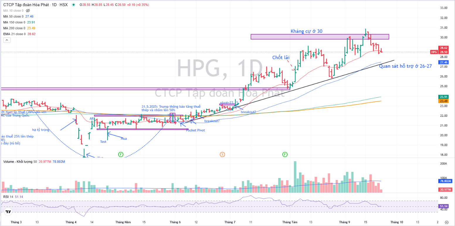Trên đồ thị, RS của HPG là 87, nằm trong số các cổ phiếu hoạt động tốt trên thị trường. Sóng thép nổi lên gần đây khi sóng chứng khoán, ngân hàng và bất động sản chững lại. Dòng tiền luân chuyển để giữ thị trường. Elibook Team đánh giá HPG có thể gặp kháng cự ở vùng giá 30, và đang thoái lùi. Khả năng vùng giá quanh MA50 ngày, 26-27,000 sẽ cung cấp điểm hỗ trợ mạnh và cung cấp điểm mua với tỷ lệ lợi nhuận/rủi ro khá tốt cho mục tiêu giá 35-37,000 đồng.
