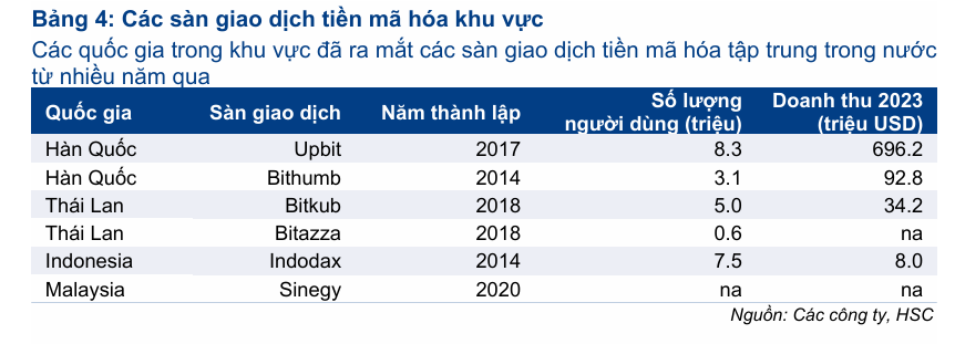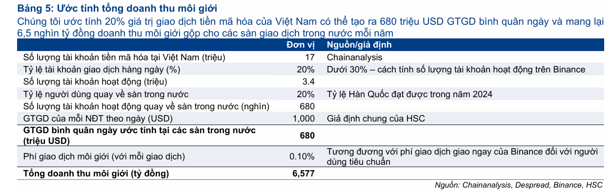 Mặc dù vậy, HSC ước tính rằng, nếu chỉ 20% giá trị giao dịch tiền điện tử của Việt Nam được chuyển về các sàn trong nước, doanh thu hàng năm có thể đạt 6,500 tỷ đồng, tương đương 22% lợi nhuận trước thuế năm 2024 của toàn ngành chứng khoán.