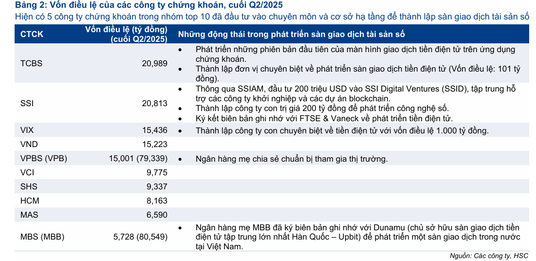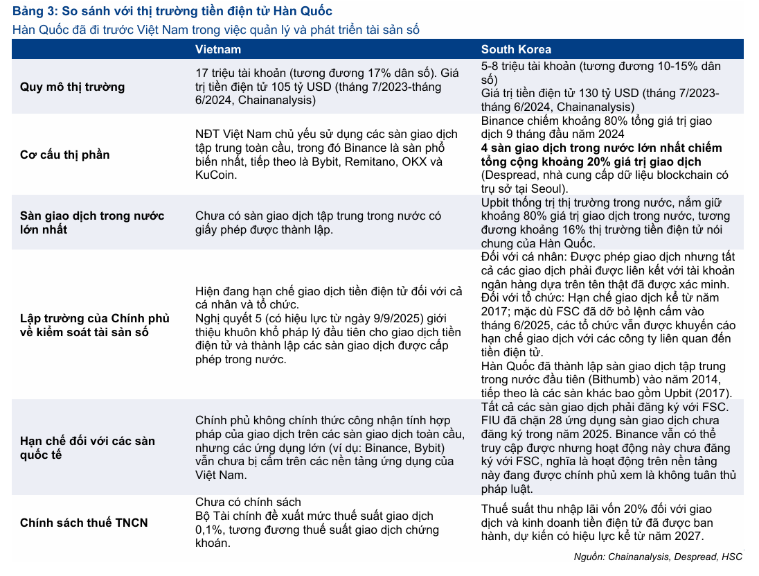 Khoảng 17 triệu người Việt đang giao dịch tiền mã hóa với tổng giá trị ước tính hơn 100 tỷ USD mỗi năm, chủ yếu thông qua các sàn nước ngoài như Binance và Bybit. Trước thực trạng này, Chính phủ đã ban hành Nghị quyết 05 cho phép thí điểm thị trường tài sản số trong 5 năm, nhằm hợp thức hóa, quản lý thuế và tích hợp vào hệ thống tài chính nội địa. Việt Nam cũng đang triển khai các sàn giao dịch được cấp phép, giao dịch bằng VND, đồng thời xây dựng hạ tầng blockchain quốc gia và hợp tác với các đối tác quốc tế để đảm bảo an toàn và minh bạch. HSC ước tính rằng, nếu chỉ 20% giá trị giao dịch tiền điện tử của Việt Nam được chuyển về các sàn trong nước, doanh thu hàng năm có thể đạt 6,500 tỷ đồng, tương đương 22% lợi nhuận trước thuế năm 2024 của toàn ngành chứng khoán