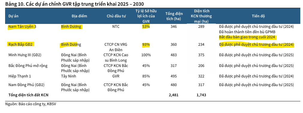 Doanh thu từ KCN: KBSV dự báo GVR sẽ bàn giao khoảng 20ha đất khu công nghiệp trong năm 2025, mang lại doanh thu 1,134 tỷ đồng (+54% yoy). Sang năm 2026, GVR bàn giao được 30 ha đất khu công nghiệp, mang về doanh thu 1,143 tỷ đồng (+ 1% yoy). Chủ yếu hai năm này bàn giao từ KCN Nam Tân Uyên 3 và KCN Rạch Bắp GĐ2