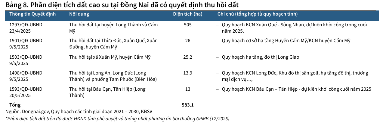 Trong đó, KBSV ước tính khoảng 583ha diện tích đất của GVR tại Đồng Nai đã có quyết định thu hồi đất của UBND tỉnh.