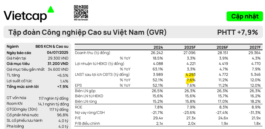 Vietcap dự báo lợi nhuận sau thuế của GVR năm 2025 sẽ tăng 8% so với cùng kỳ, đạt 4,300 tỷ đồng, nhờ tốc độ chuyển đổi đất nhanh hơn. Đối với năm 2026/2027, lợi nhuận dự kiến tiếp tục tăng trưởng 11%/12%, nhờ nhu cầu cao su gia tăng và quá trình chuyển đổi đất.