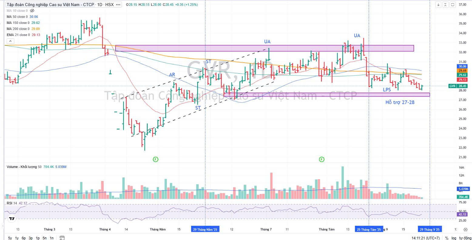 Trên đồ thị, GVR có vùng giá hỗ trợ mạnh ở 27-28,000. Có thể MUA ở vùng giá này. Lưu ý, sóng ngành BĐS KCN yếu.