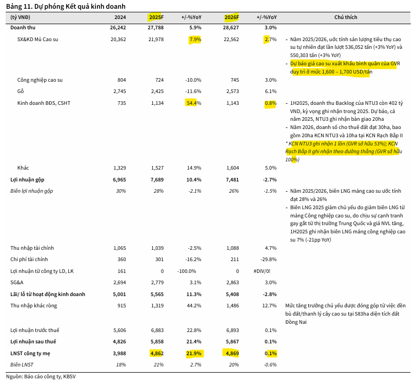 Năm 2025/2026, KBSV ước tính sản lượng cao su của GVR đạt 536,052 tấn/550,303 tấn (+3%YoY/+3%YoY), tương đương với doanh thu mảng cao su đạt 21,978 tỷ đồng (+8% YoY) và 22,562 (+3% YoY).