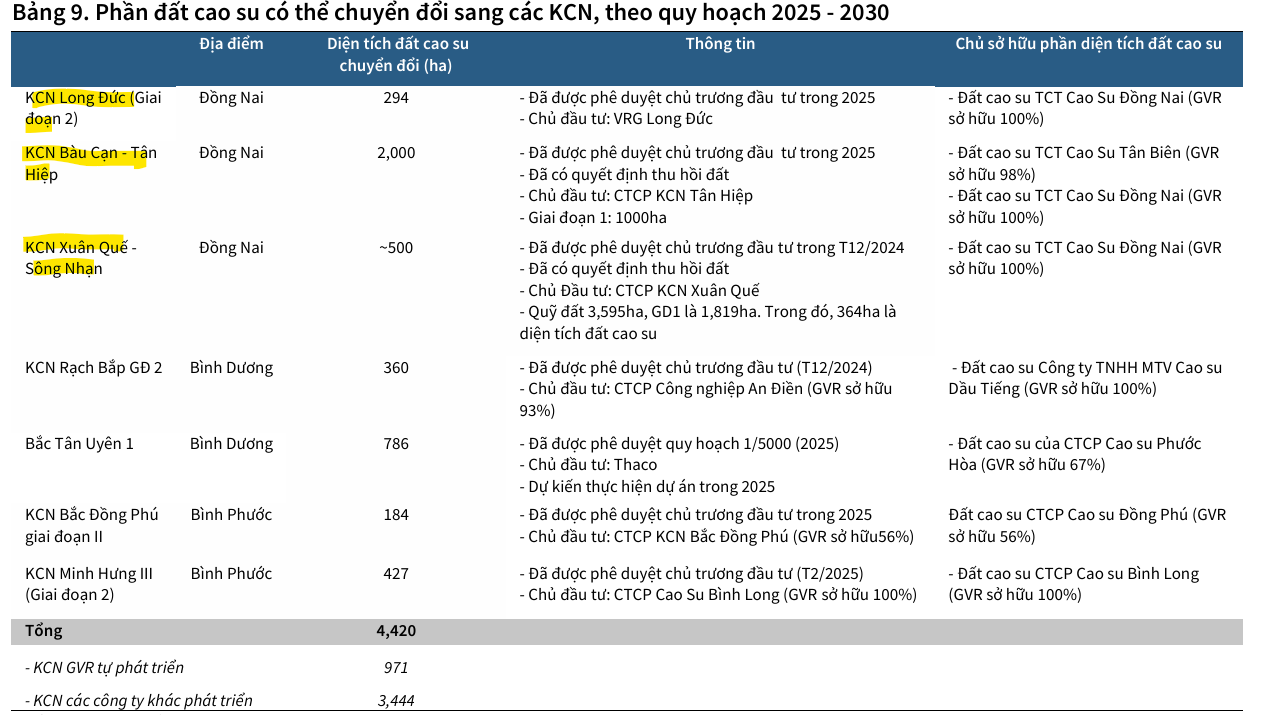 Vietcap đánh giá việc chuyển đổi đất cao su là động lực chính thúc đẩy lợi nhuận trong dài hạn. GVR đã nhận được chấp thuận đầu tư cho nhiều dự án KCN mới. Vietcap ước tính GVR sẽ nhận được dòng tiền trung bình 2,100 tỷ đồng/năm từ cho thuê và chuyển đổi đất KCN trong giai đoạn 2025-2027.