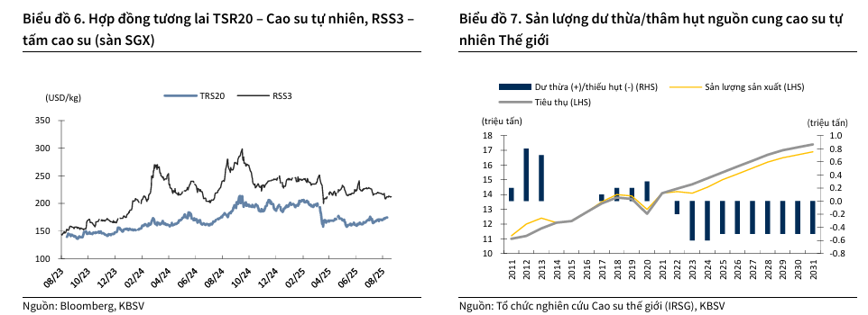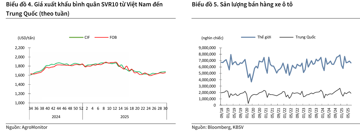 Giá cao su phục hồi: KBSV duy trì quan điểm lạc quan về giá cao su, dự báo giá trung bình năm 2025-2026 sẽ đạt 1,600 – 1,700 USD/tấn. Đà tăng này được thúc đẩy bởi nhu cầu từ thị trường Trung Quốc và tình trạng thiếu hụt nguồn cung toàn cầu.
