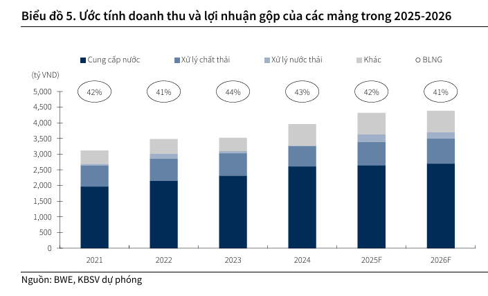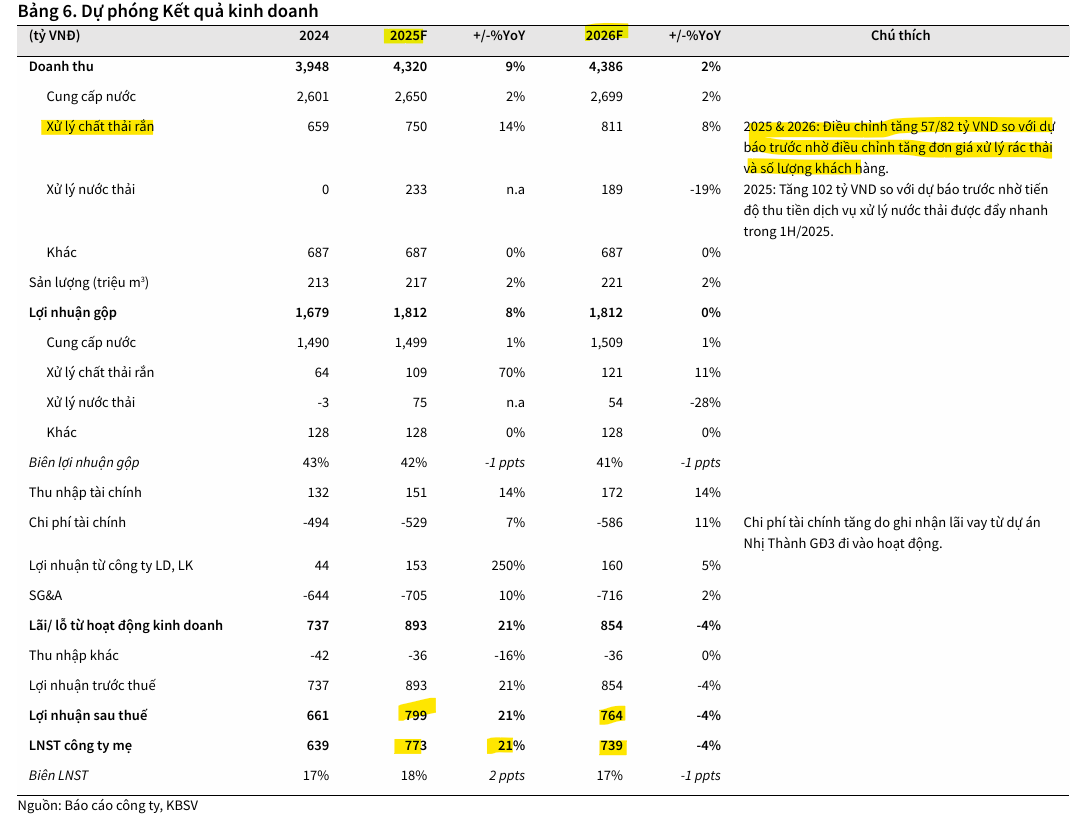 Dù vậy, kỳ vọng căng thẳng thuế quan hạ nhiệt sẽ giúp sản xuất ổn định trở lại, hỗ trợ tiêu thụ nước phục hồi. KBSV dự báo doanh thu mảng cấp nước dự kiến tăng nhẹ 2% YoY, đạt 2,649/2,699 tỷ đồng trong 2025/2026.