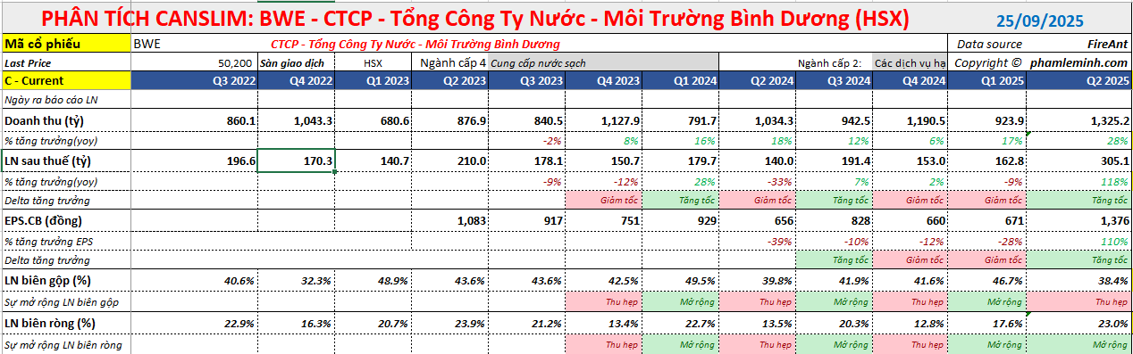 Doanh thu quý 2/2025 của BWE đạt 1,325 tỷ đồng (+28% so với cùng kỳ), và lợi nhuận sau thuế đạt 303 tỷ đồng (+123% so với cùng kỳ), mức cao kỷ lục kể từ năm 2021.