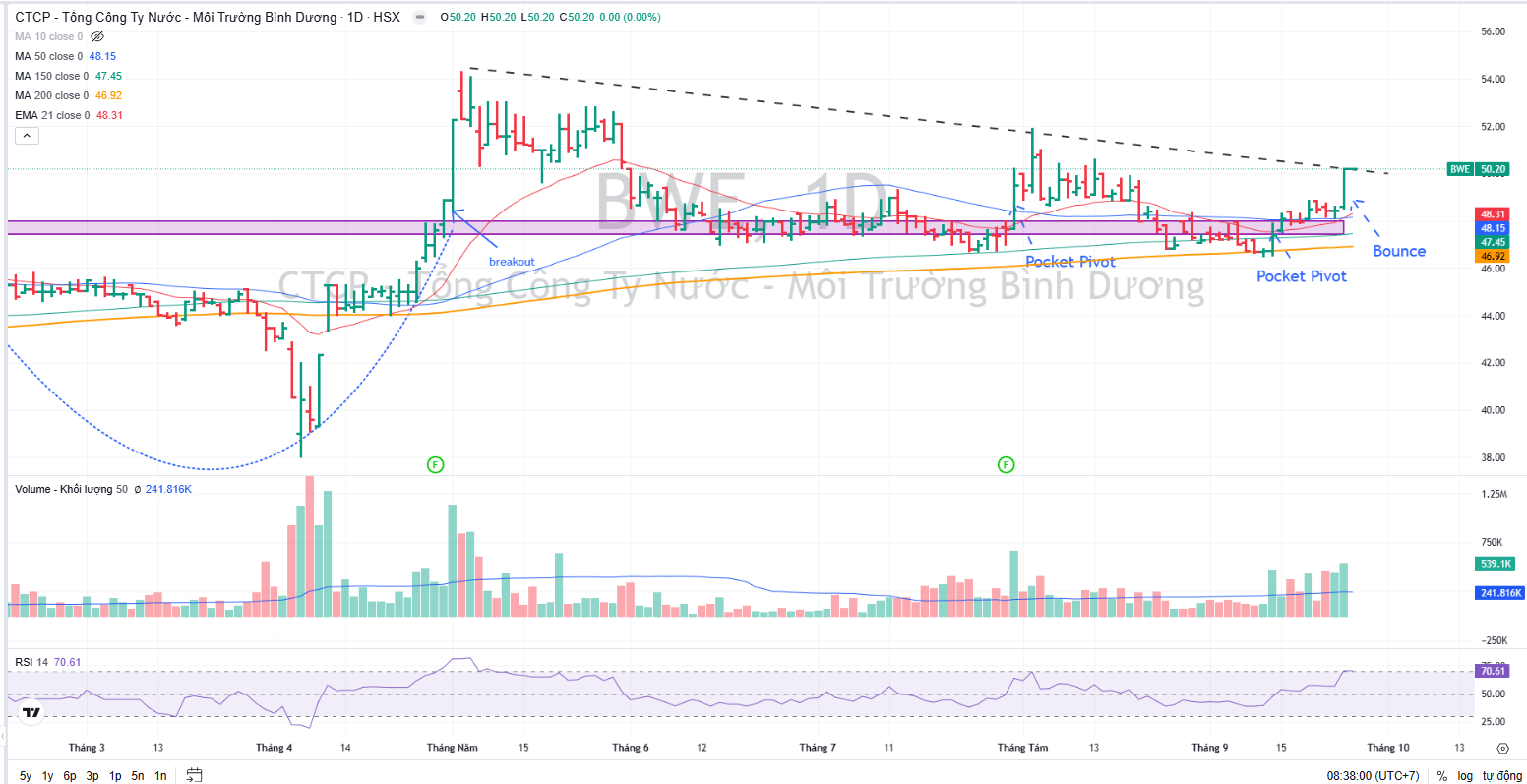 Ngày 24.9.2025, BWE tăng giá 3.6% và có điểm mua bật nảy (Bounce) từ MA50 ngày với thanh khoản lớn. Trader có thể mở vị thế mua ở BWE quanh vùng giá 50-51.