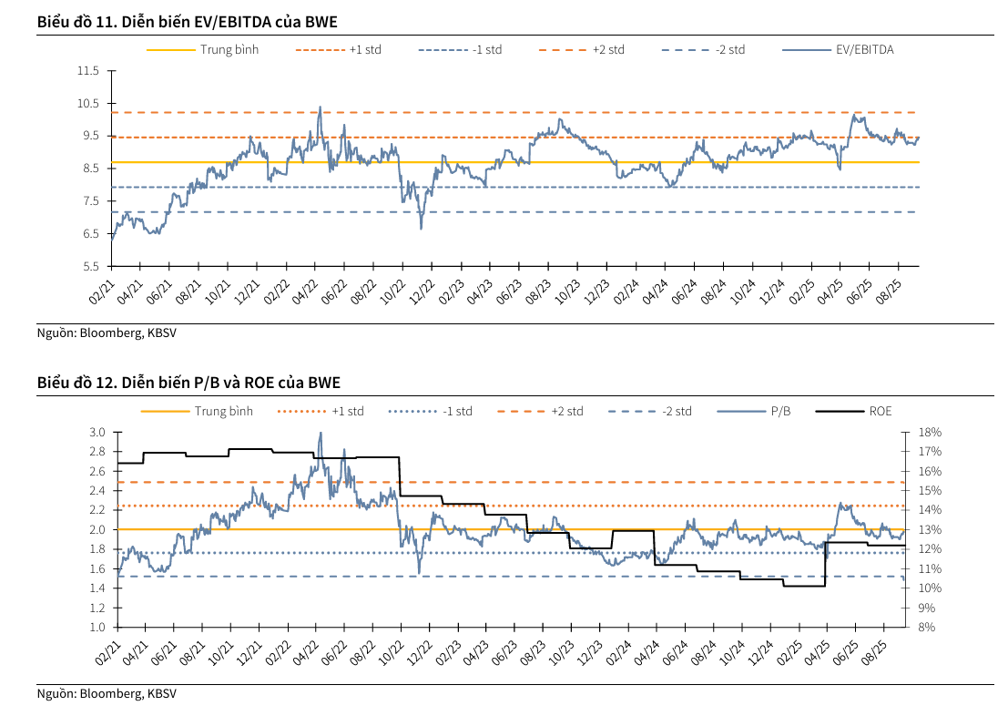BWE đang giao dịch quanh mức trên một độ lệch chuẩn trung bình 5 năm EV/EBITDA, nhưng KBSV tin rằng triển vọng dài hạn của mảng môi trường cùng với chiến lược đa dạng hóa địa bàn sẽ bù đắp cho sự giảm tốc của mảng cấp nước trong ngắn hạn.