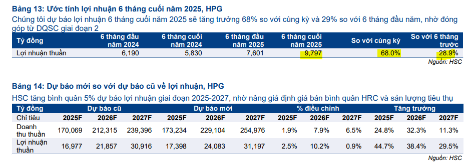 Theo HSC, lợi nhuận thuần nửa cuối năm 2025 của HPG dự kiến đạt 9,800 tỷ đồng, tăng 68% so với cùng kỳ, nhờ mùa cao điểm xây dựng và đóng góp lợi nhuận từ DQSC giai đoạn 2.