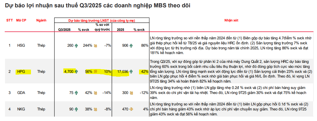 Dự đoán của MBS và HSC lạc quan hơn so với VDSC. Theo đó, lợi nhuận của HPG tăng 39% so với cùng kỳ năm 2024, đạt 4,193 tỷ đồng. Mặc dù sản lượng thép xây dựng có thể giảm nhẹ do yếu tố mùa vụ, sản lượng HRC được dự báo sẽ tăng 62% so với cùng kỳ.
