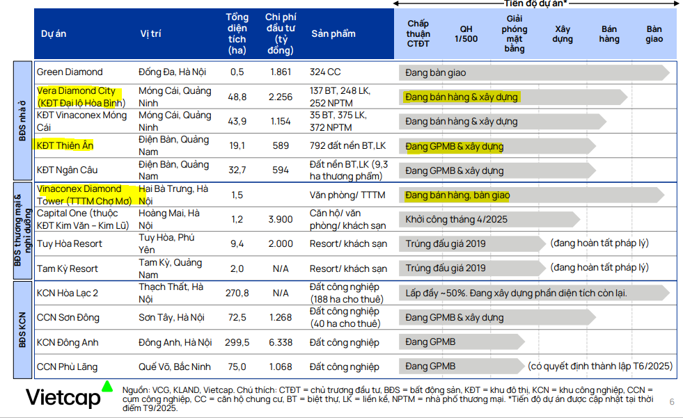 Tại thời điểm T9/2025, tiến độ các dự án BĐS nhà ở vẫn đang đúng kế hoạch. VCG cũng đã khởi công dự án thương mại Capital One vào T4/2025 và nhận quyết định thành lập CCN Phú Lãng vào T6/2025.
