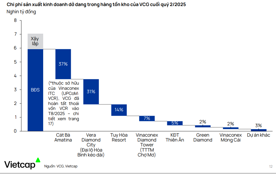 Tại thời điểm cuối quý 2/2025, ngoại trừ dự án Cát Bà Amatina (đã được VCG chuyển nhượng vào T8/2025*), dự án Vera Diamond City (Đại Lộ Hòa Bình Kéo Dài) chiếm phần lớn hàng tồn kho của VCG.