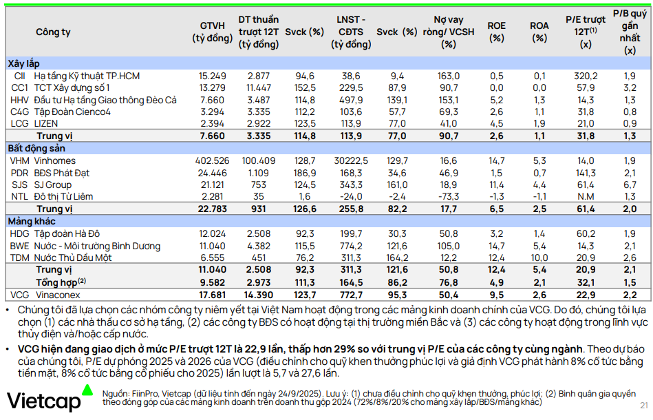 VCG hiện đang giao dịch ở mức P/E trượt 12 tháng là 22.9 lần, thấp hơn so với trung vị của các công ty cùng ngành. Vietcap tin rằng định giá của VCG sẽ tiếp tục được hưởng lợi từ việc đẩy mạnh đầu tư công trong thời gian tới.