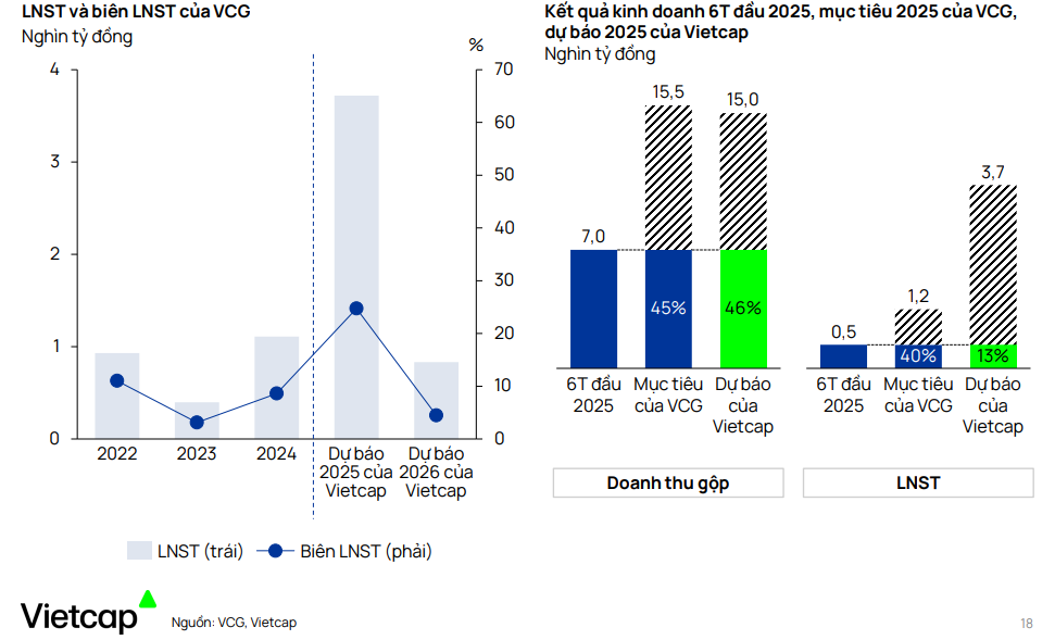 Khoản lợi nhuận này sẽ giúp lợi nhuận sau thuế cả năm 2025 của VCG đạt 3,700 tỷ đồng, tăng trưởng 236% so với cùng kỳ. Sang năm 2026, lợi nhuận sau thuế của VCG sẽ giảm về mức bình thường 832 tỷ đồng.